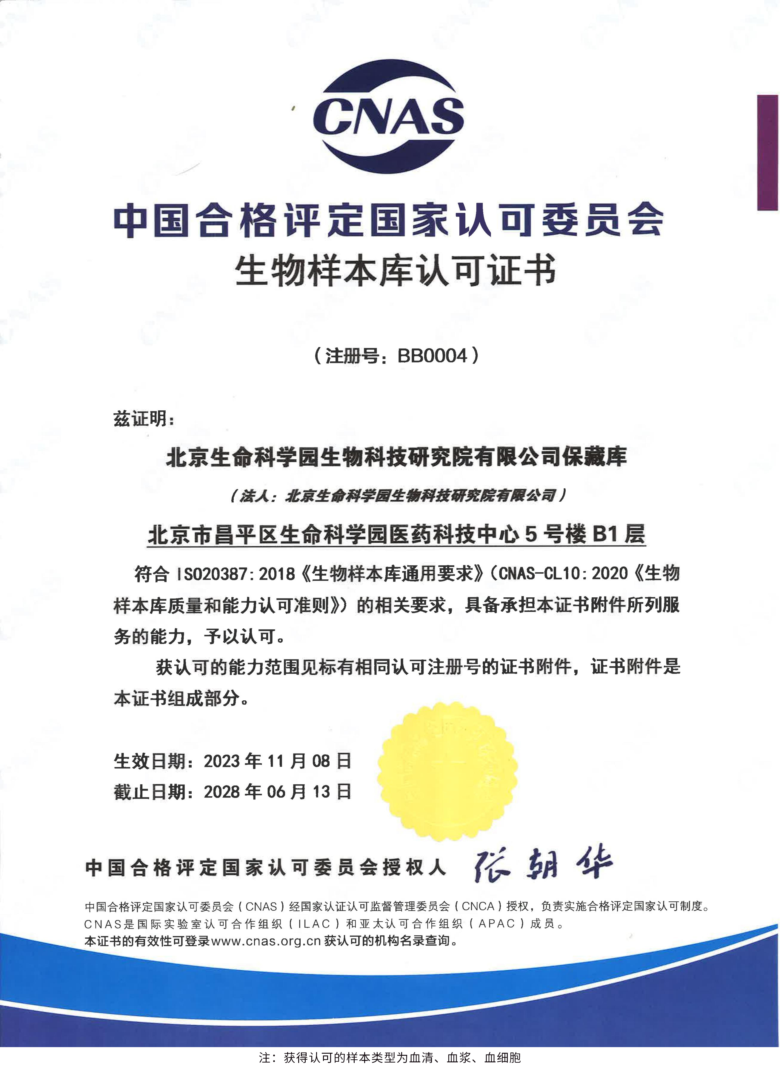 北京生命科學(xué)園生物科技研究院(以下簡稱“北京生物樣本資源庫”)(Biobank of Life Science Park,簡寫“BoLSP”)是一家由北京市科委和中關(guān)村生命科學(xué)園共同支持設(shè)立的第三方生物樣本庫公共服務(wù)平臺,秉承北京重大疾病臨床數(shù)據(jù)和樣本資源庫(以下簡稱“北京庫”)(Beijing Biobank of Clinical Resources,BBCR)十余年的發(fā)展成果,聚合眾多臨床樣本專家的專業(yè)共識,致力于在生命科學(xué)、生物醫(yī)藥研究領(lǐng)域發(fā)揮銜接樣本資源持有者與研究者的橋梁作用,解決生物樣本資源開發(fā)上下游信息不對稱、資源共享困難等問題。研究院在北京中關(guān)村生命科學(xué)園昌平園區(qū)建立了2000㎡生物樣本庫,最大存儲規(guī)模達1000萬份。研究院遵循CNAS-CL10:2020《生物樣本庫質(zhì)量和能力認可準則》,同時結(jié)合北京庫過去十年的工作經(jīng)驗與教訓(xùn),建立了一套完善的生物樣本保藏質(zhì)量管理體系,從人、機、料、法、環(huán)、控多個角度,實現(xiàn)生物樣本保藏過程的全面質(zhì)量控制,先后獲得國家科技部頒發(fā)的人類遺傳資源保藏行政許可證書和中國合格評定國家認可委員會(China National Accreditation Service for Conformity Assessment,CNAS)頒發(fā)的“CNAS認可證書”。